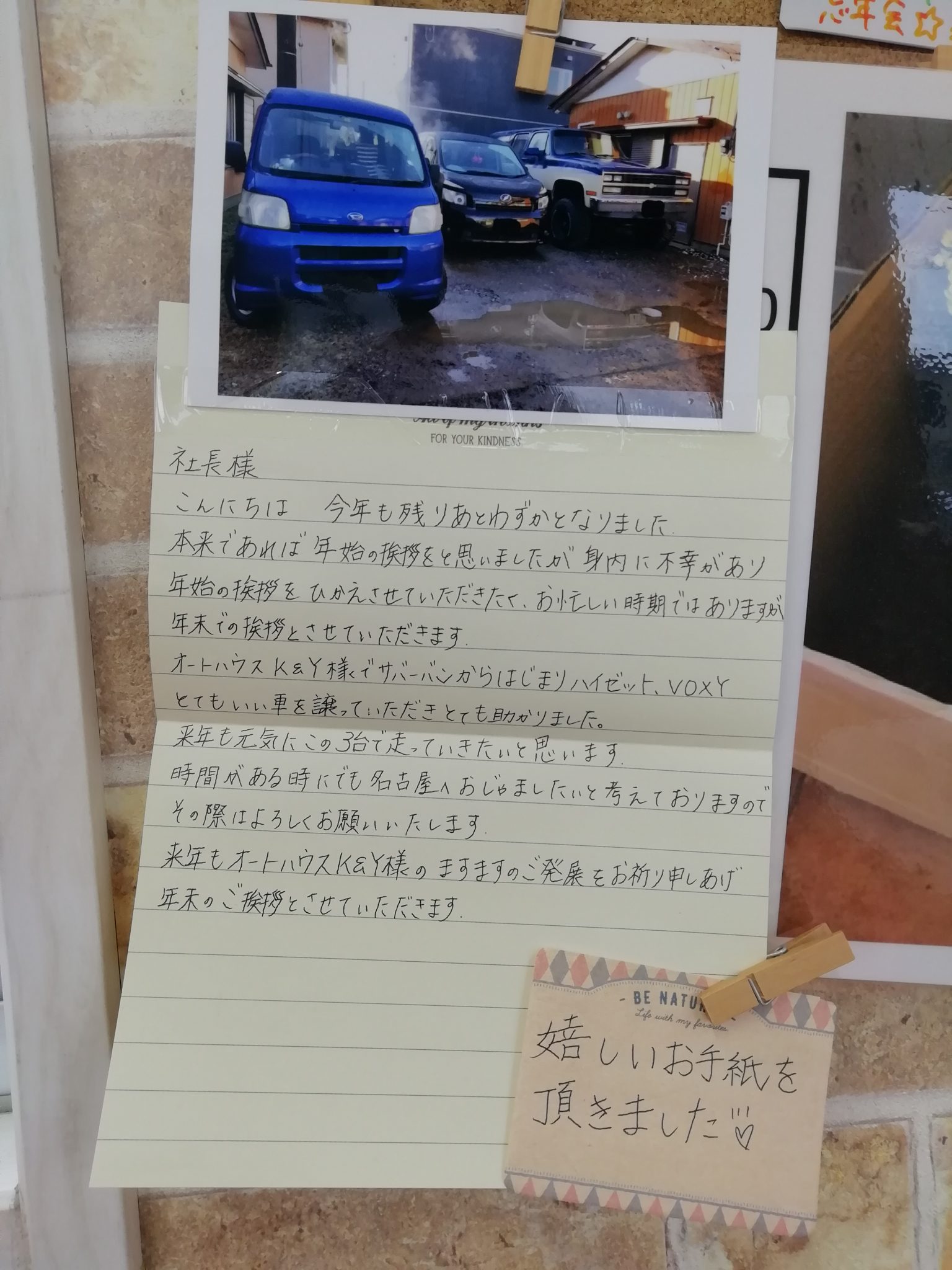 12月 26 嬉しいお手紙をいただきました😂✨ 名古屋市緑区で中古車販売・板金・車検をしている株式会社オートハウスK &Yです🚘 茨城県のお客様から心温まるお手紙をいただきました... 新着情報 Share