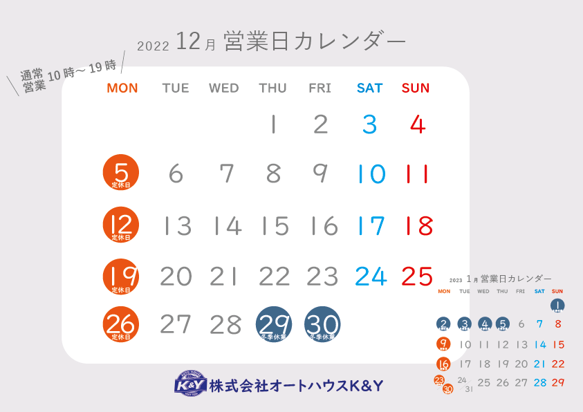 11月 30 \12月営業日について/ 取得率5%未満 1級自動車整備士(全国自動車整備士における)在中! 株式会社オートハウスK &Y 名古屋市緑区で中古車販売・買取・修理・板金・車検を... 新着情報 ブログ 営業日カレンダー Share