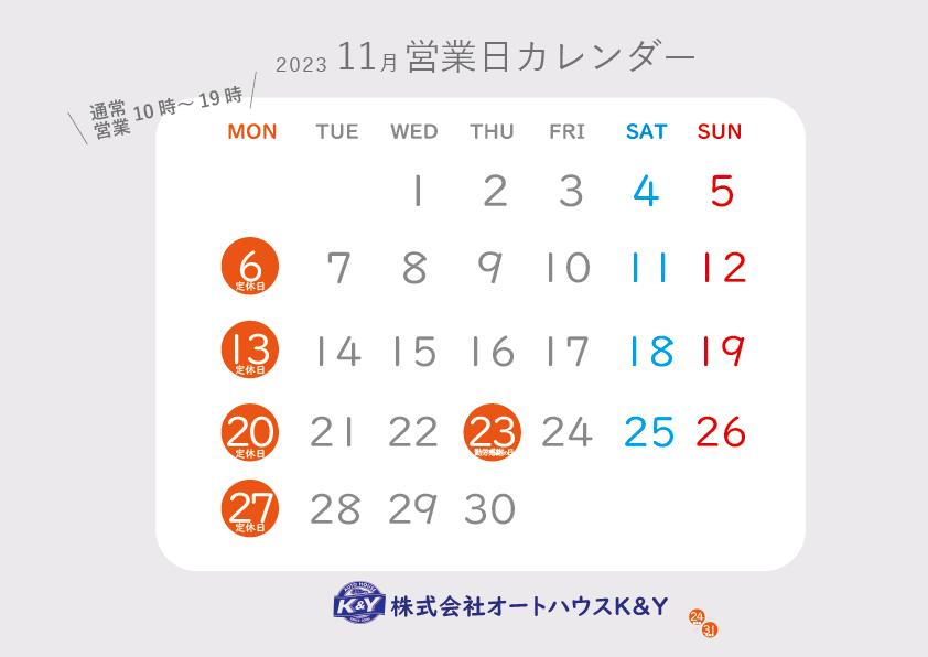 10月 26 \11月営業日のお知らせ/ 取得率5%未満 1級自動車整備士(全国自動車整備士における)在中! 株式会社オートハウスK &Y 名古屋市緑区で中古車販売・買取・修理・板金・車検を... 新着情報 ブログ スタッフ 営業日カレンダー Share