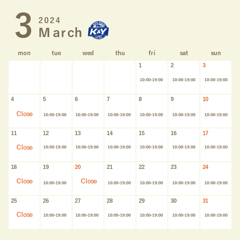 2月 21 \3月営業日のお知らせ/ 10取得率5%未満 1級自動車整備士(全国自動車整備士における)在中! 株式会社オートハウスK &Y 名古屋市緑区で中古車販売・買取・修理・板金・車... 新着情報 ブログ 営業日カレンダー 営業日のお知らせ Share